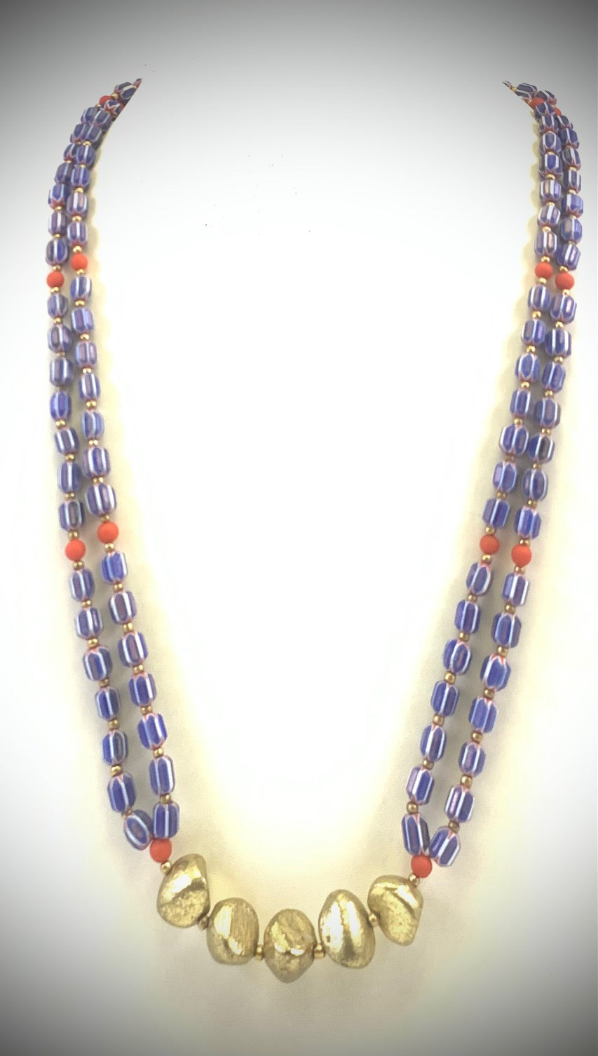 NK14923 GLASS/CHEVRON BEAD WITH GOLD METAL NUGGET NECKLACE