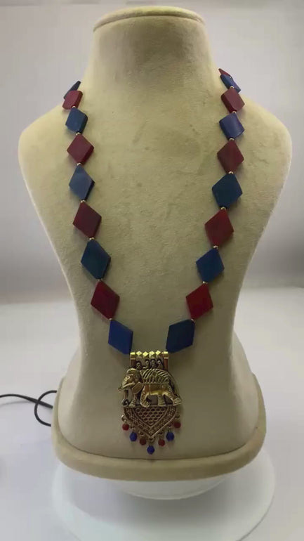 HORN/BLUE BEAD WITH GOLD METAL BOLL & GOLD METAL PENDANT NECKLACE