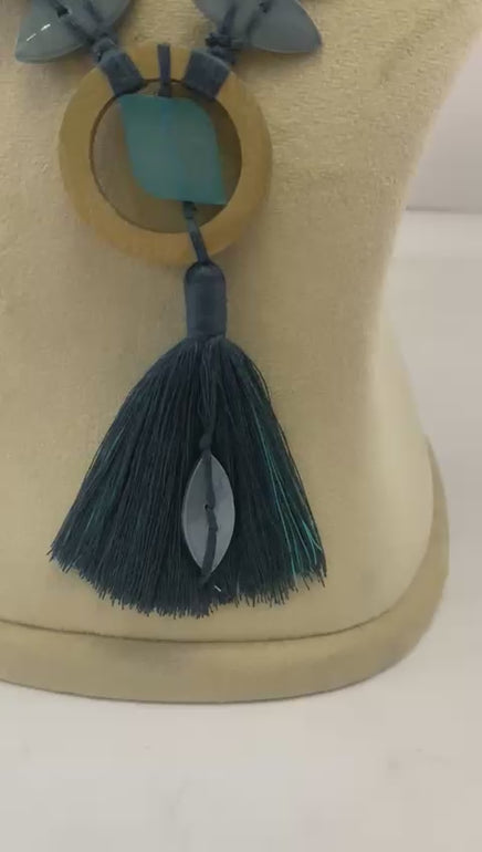 Handcrafted necklace featuring natural wooden and horn beads arranged with a decorative ring accent. Adorned with delicate shell elements and a vibrant thread tassel in turquoise. The adjustable design measures 24 inches with a 5-inch extension, allowing versatile styling options. Perfect for adding bohemian charm to any outfit. Each piece celebrates traditional artisanal craftsmanship with sustainable natural materials.