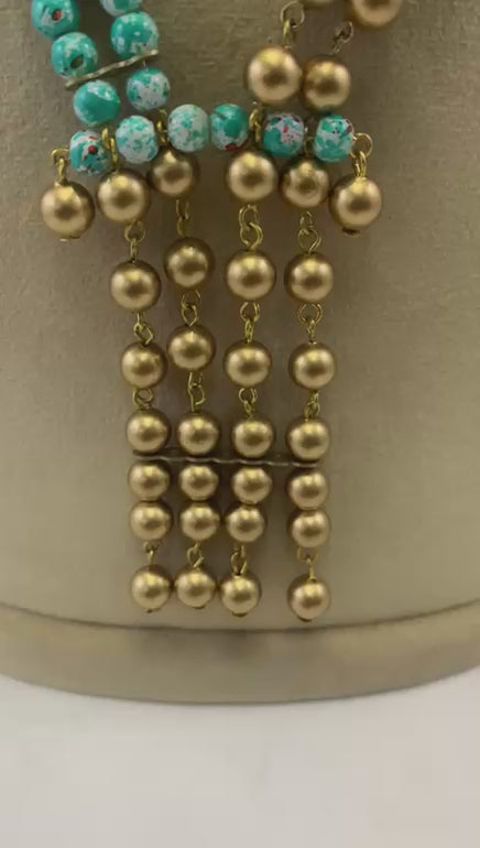 Elegant glass and copper-coated plastic bead necklace featuring a delicate metal chain with ring detail. The turquoise beads add a vibrant pop of color, while the gold-toned metal accents provide a sophisticated finish. Perfect for layering or wearing solo, this versatile piece measures 24 inches with a 3½ inch extender for adjustable fit. Ideal for everyday wear or special occasions.