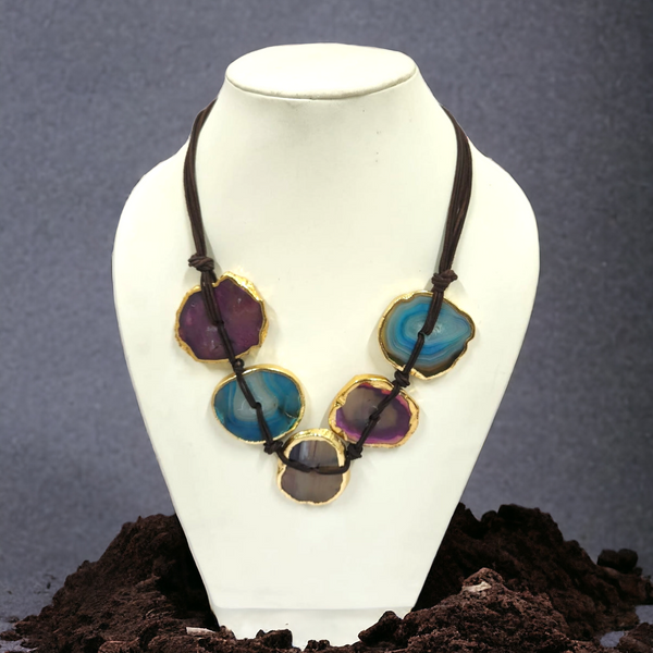 This is a 24-inch wax cord necklace featuring enchanting purple and blue agate stones, offered at an attractive price of Rs 1000. The combination of wax cord and agate stones creates a stunning contrast, exuding a vibrant and stylish appeal. The varying shades of purple and blue within the agate stones add a mesmerizing touch to this accessory. With its versatile length and captivating gemstones, this necklace becomes a standout piece that effortlessly enhances any attire with its elegant and eye-catching design.